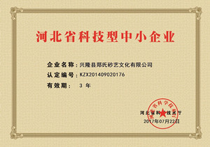 2017年7月22日,經(jīng)河北省科技廳審核評(píng)定,鄭氏砂藝文化有限公司被評(píng)為《河北省科技型中小企業(yè)》。這是繼2013年后,我公司再次獲此殊榮。
