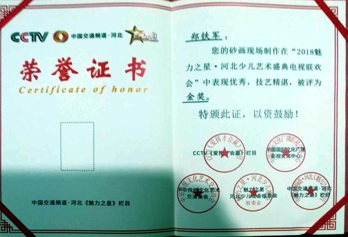 鄭氏砂畫制作榮獲“2018魅力之星河北少兒藝術(shù)盛典電視聯(lián)歡會(huì)”金獎(jiǎng),同時(shí)鄭氏砂藝文化有限公司被授予中國(guó)交通頻道·河北魅力之星“藝術(shù)教育培訓(xùn)基地”。