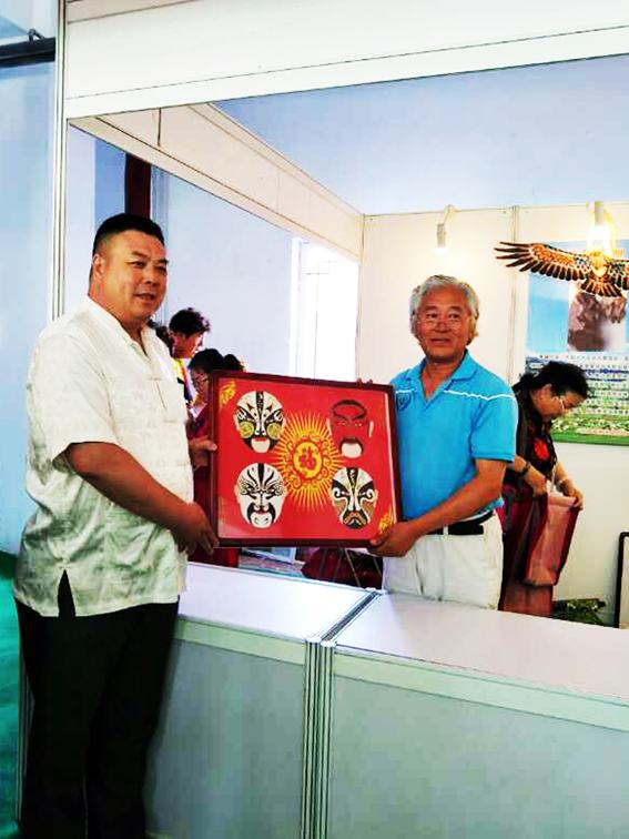 鄭氏砂藝總經(jīng)理鄭鐵軍捐贈砂畫《組合臉譜》并與烏蘭察布市民間藝術(shù)家協(xié)會副主席肖占貴合影