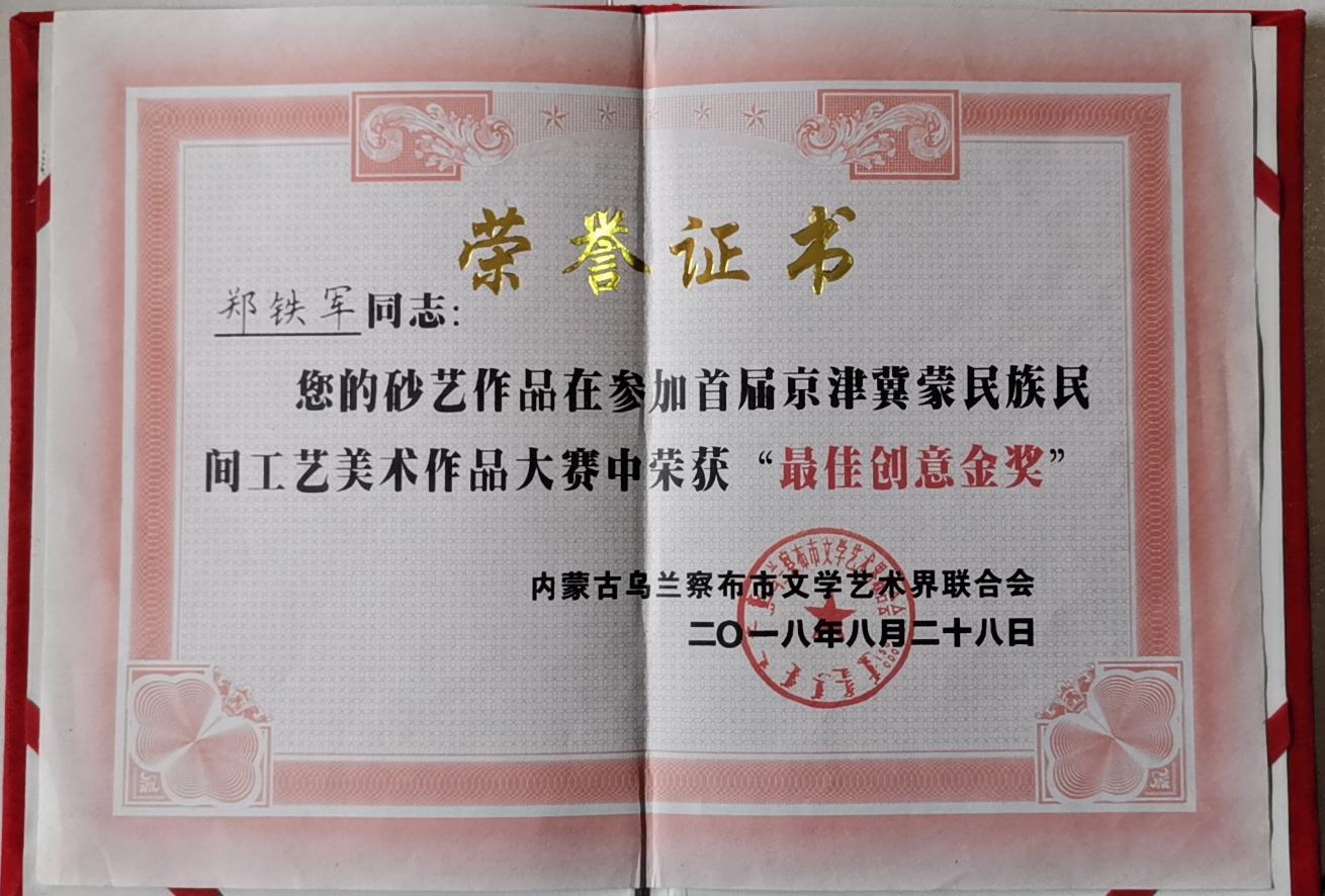 二〇一八年八月十七日至二十一日,烏蘭察布市首屆京津冀蒙民族民間藝術(shù)博覽會在內(nèi)蒙古自治區(qū)烏蘭察布市開幕。興隆縣鄭氏砂藝(畫)以承德市唯一一家省級非遺民間藝術(shù)產(chǎn)品出席開幕式并參展。在活動中鄭氏砂畫藝術(shù)品受到社會各界人士一致好評,并榮獲首屆京津冀蒙民族民間工藝美術(shù)作品大賽“最佳創(chuàng)意金獎”。