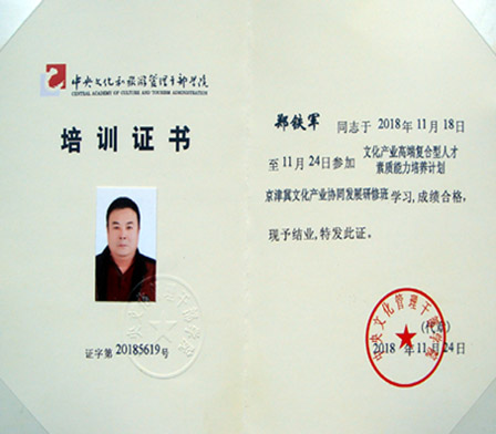 20181118日至24日,興隆縣鄭氏砂藝文化有限公司執(zhí)行董事鄭鐵軍同志,受邀參加中央文化管理干部學(xué)院舉辦的“文化產(chǎn)業(yè)高端復(fù)合型人才素質(zhì)能力培養(yǎng)計(jì)劃京津冀文化產(chǎn)業(yè)協(xié)同發(fā)展研修班”學(xué)習(xí),于1124日?qǐng)A滿結(jié)業(yè)。