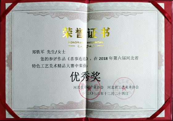 特博會期間,參展作品《喜事連連》榮獲2018年第六屆河北省特色工藝美術精品大賽“優秀獎”。