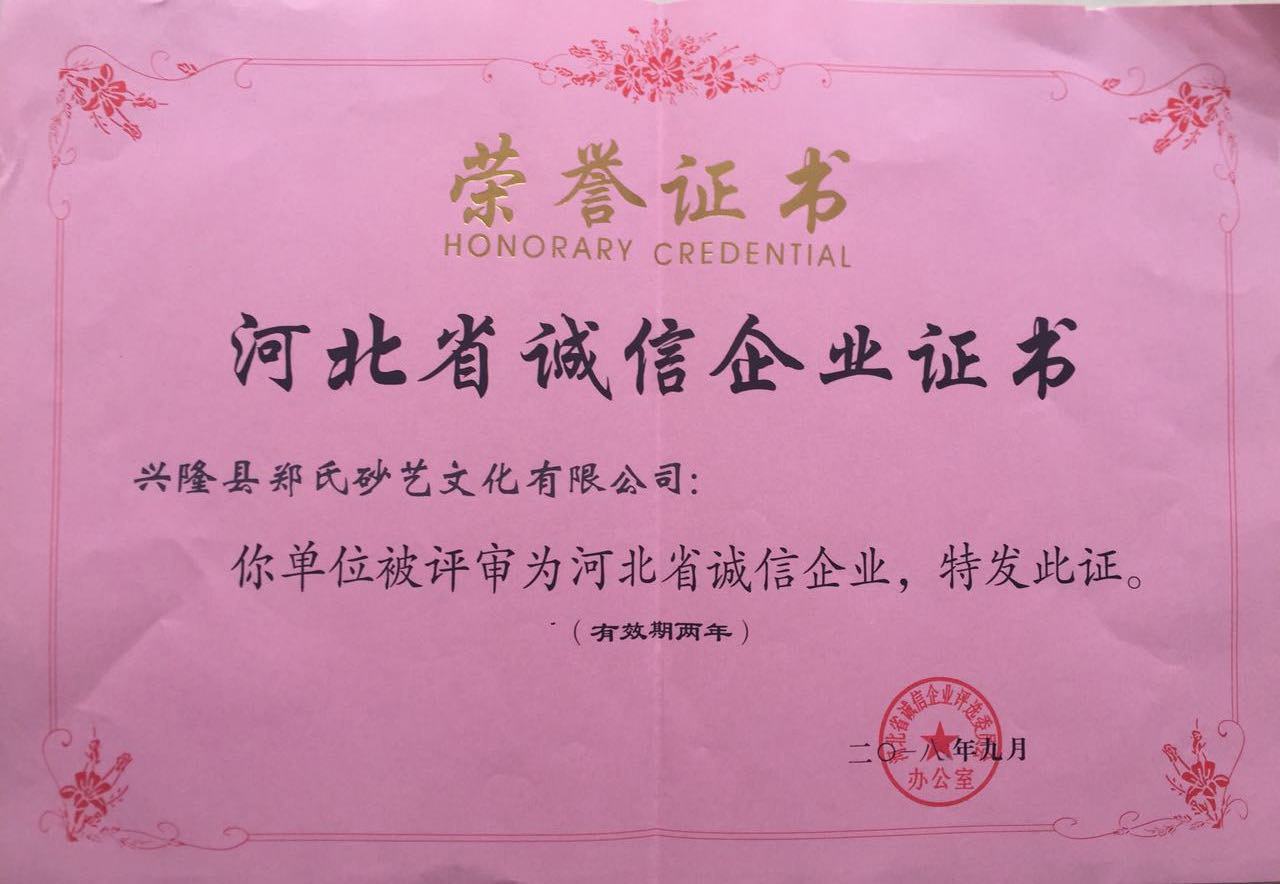 2018年9月27日,興隆縣鄭氏砂藝文化有限公司榮獲了由河北省誠信企業評選委員會辦公室頒發的《河北省誠信企業》稱號,這是繼2014年、2016年后連續第三次獲此殊榮,為構建誠信河北、和諧河北、促進全省經濟平穩較快發展發揮了積極的帶頭作用,為推動我省誠信企業建設做出了一定的貢獻。鄭氏砂藝將珍惜榮譽、再接再厲,在創建誠信企業活動中不斷做出新成績。
