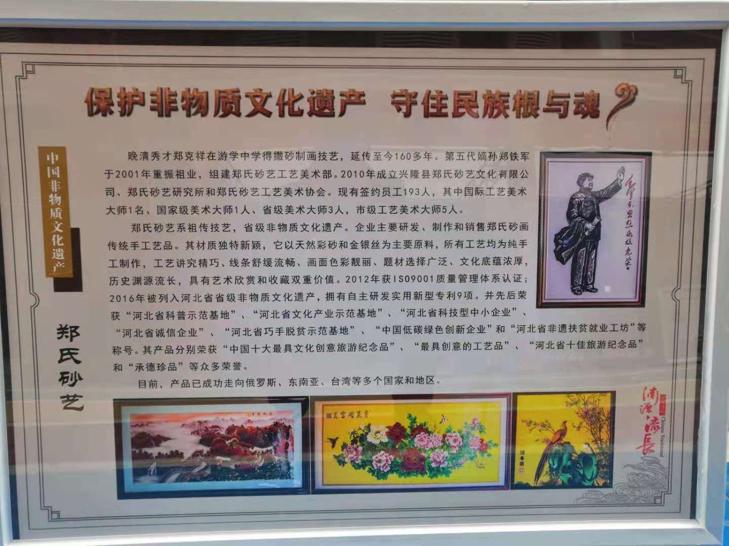 2021年5月15日,鄭氏砂藝應邀參加三河市文化廣電和旅游局 “2021 年中國旅游日京津冀文旅資源推介暨 ‘京東文旅圈’成立”系列活動,活動旨在有效推動京津冀協同發展重大國家戰略,加快推進興隆縣、遵化市、三河市等京東九縣(市、區)一體化發展步伐,構建文旅定位精準清晰、資源高效利用、產業集群發展的區域發展新格局,共同打造京津冀文旅協同發展區。興隆縣旅游和文化廣電局局長莊云飛帶領我縣特色文旅企業參加了此次活動,其中鄭氏砂藝代表我縣非遺文化產業出席活動,展出特色砂畫作品51幅,展出效果良好,得到了參觀人員一致好評。