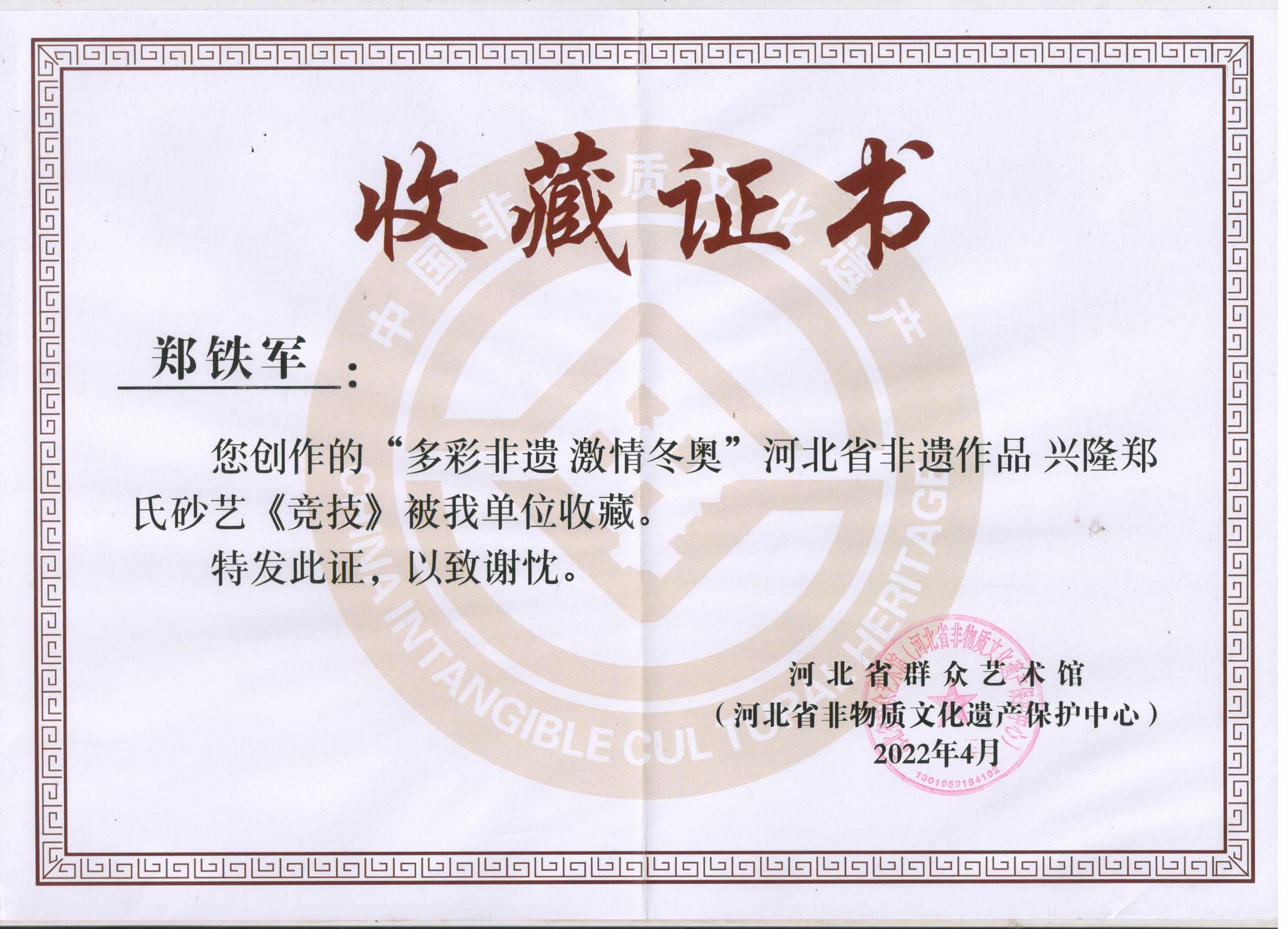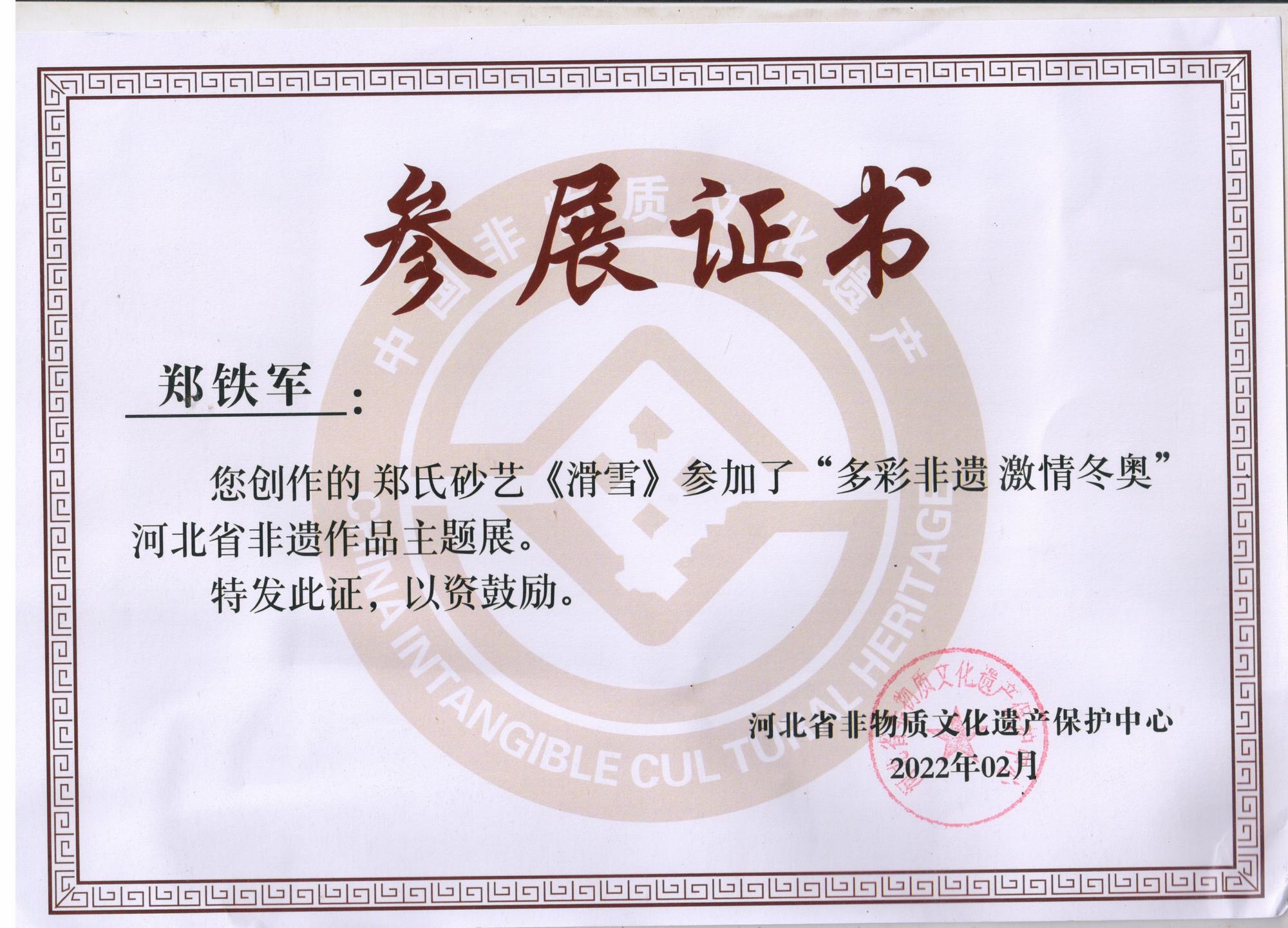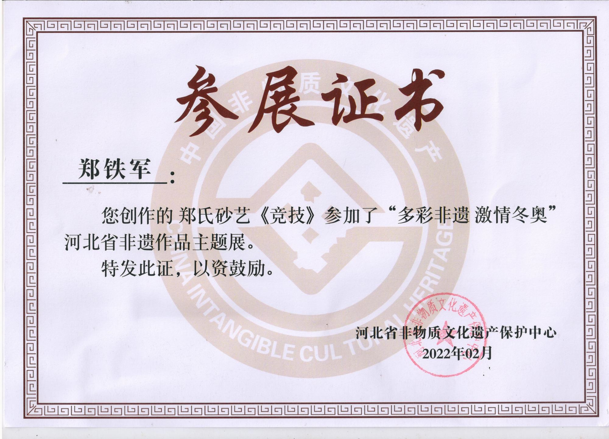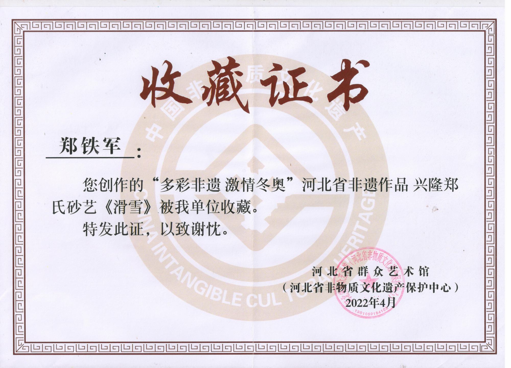 2022年北京冬奧會(huì)是我國(guó)重大歷史節(jié)點(diǎn)的重大標(biāo)志性活動(dòng),也是河北省推動(dòng)京津冀協(xié)同發(fā)展、雄安新區(qū)規(guī)劃建設(shè)、冬奧會(huì)籌辦“三件大事”之一。因此省群眾藝術(shù)館(省非遺保護(hù)中心)按照河北省文化和旅游廳的部署在全省開展了“多彩非遺激情冬奧”非遺主題作品征集活動(dòng),本次作品以冬奧文化、冰雪文化、春節(jié)文化為題材,通過(guò)藝術(shù)展現(xiàn)冰雪運(yùn)動(dòng),應(yīng)邀鄭氏砂藝執(zhí)行董事國(guó)際工藝美術(shù)大師鄭鐵軍創(chuàng)作的砂畫作品《滑雪》、《競(jìng)技》兩幅作品參展,并被省群眾藝術(shù)館和省非物質(zhì)文化遺產(chǎn)保護(hù)中心永久收藏。