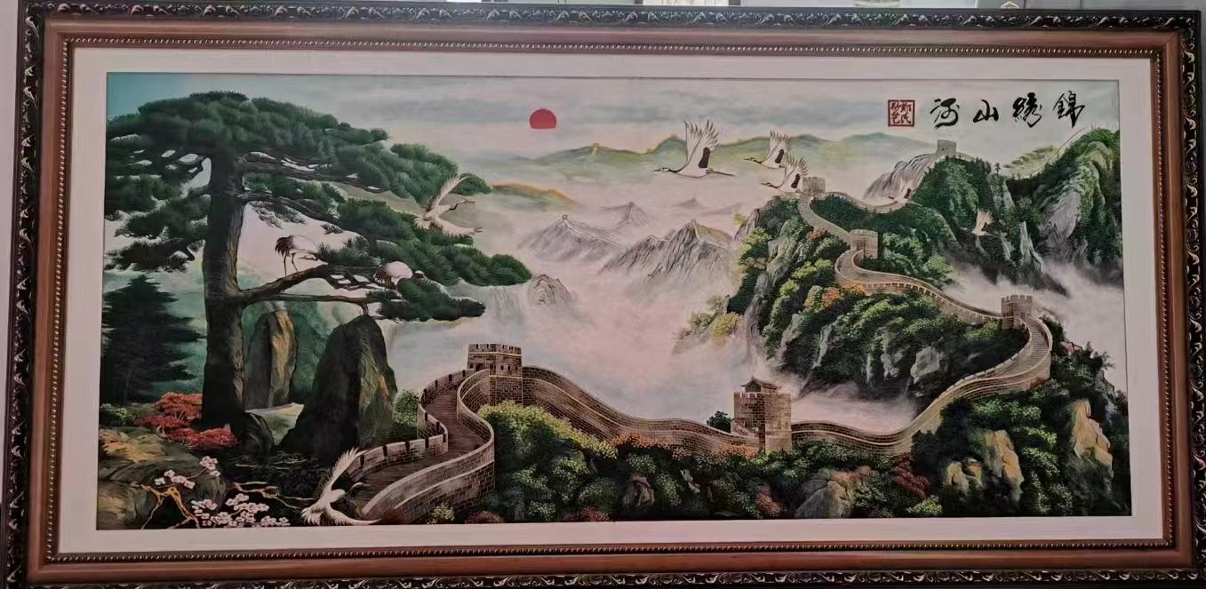 整幅畫以高山、長(zhǎng)城、云霧、旭日、大雁、迎客松以及巧妙的畫技呈現(xiàn)了祖國(guó)大好河山的壯麗景色。,畫中山情水勢(shì),脈落分明,虛實(shí)并舉,映帶盤旋,具有"神而不盡"的詩(shī)情畫意。所以這幅《錦繡山河》是會(huì)議室、辦公室和居家裝飾的最佳裝飾品!是鎮(zhèn)宅納財(cái)之靈寶,具有極高的觀賞和收藏多重價(jià)值!