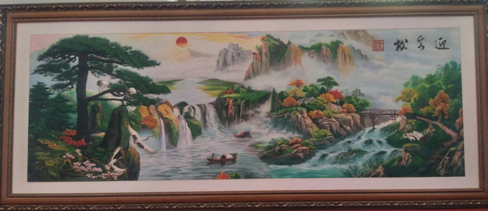 這幅《迎客松》遠景旭日東升,輕煙淡巒,云煙浮動,云霞卷舒;近景綿綿群山,山勢險峻,波濤洶涌,草木澤生,洋溢著盎然生機。而那垂直的瀑布,不禁讓我想起詩仙李白的一首詩:“飛流直下三千尺,疑是銀河落九天”。自古以來,古松便蒼天筆挺,有君子之威風(fēng),是祈福之寓意。這幅畫構(gòu)圖遠虛近實,近景突兀、遠景清雅,筆力剛勁挺拔、渾厚沉著、墨氣明潤,濃淡虛實相生。當然這幅畫寓意迎福招財。是會議室、辦公室和居家裝飾之首選,有生意興旺,迎客招財?shù)淖T?作品寓意美好,作為禮品贈送給親朋好友也是上佳選擇!
