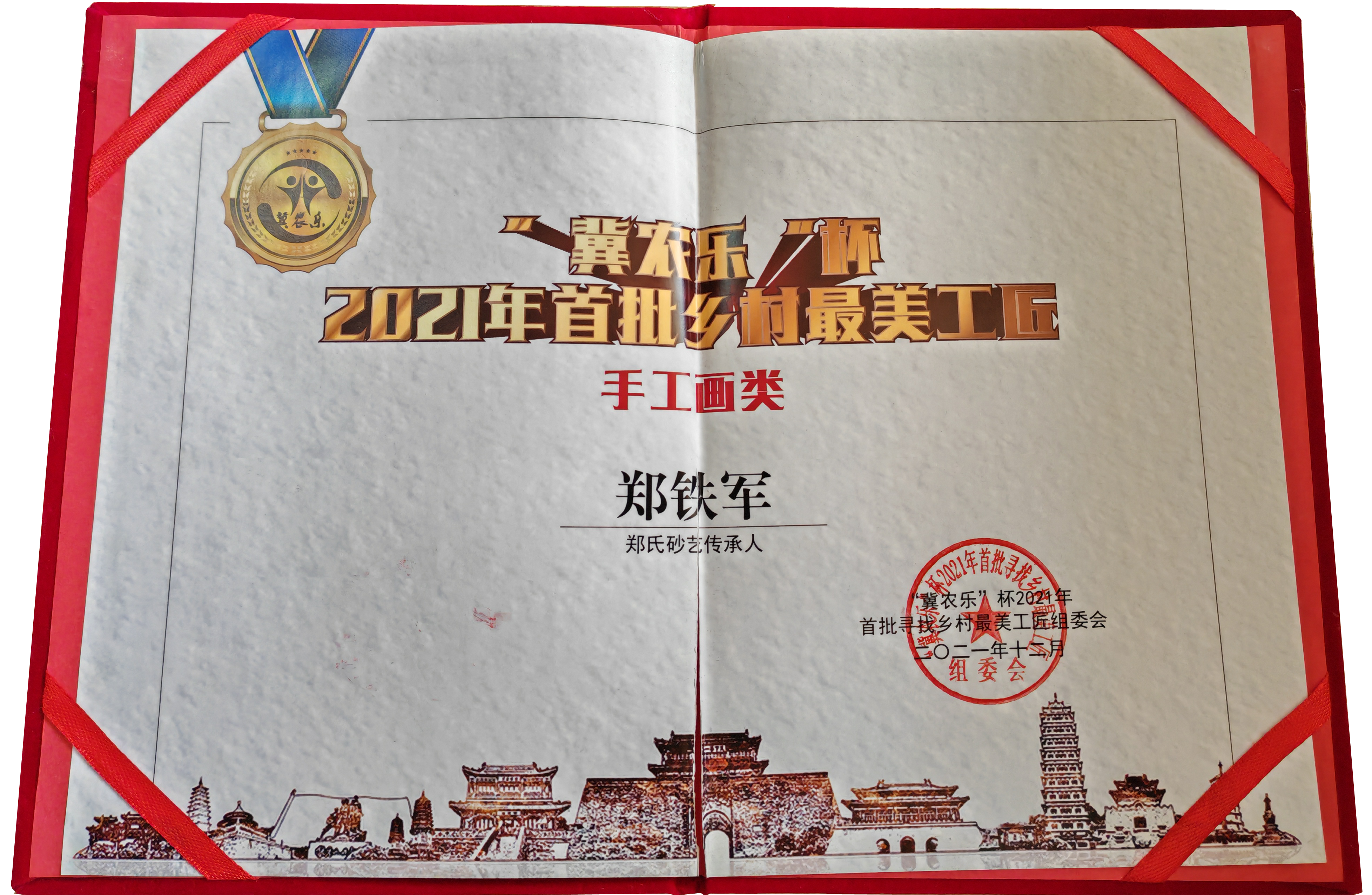 2021年,興隆縣鄭氏砂藝文化有限公司鄭鐵軍在“冀農樂”2021年首批鄉村最美工匠——手工畫類 獲獎,并由“冀農樂”杯2021年首批尋找鄉村最美工匠組委會頒發獎狀。