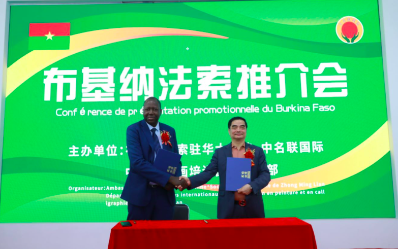 (中名聯(lián)國際圖片說明:布基納法索國家推介會上,中名聯(lián)集團(tuán)與布基納法索駐華大使館正式簽屬了合作協(xié)議。)