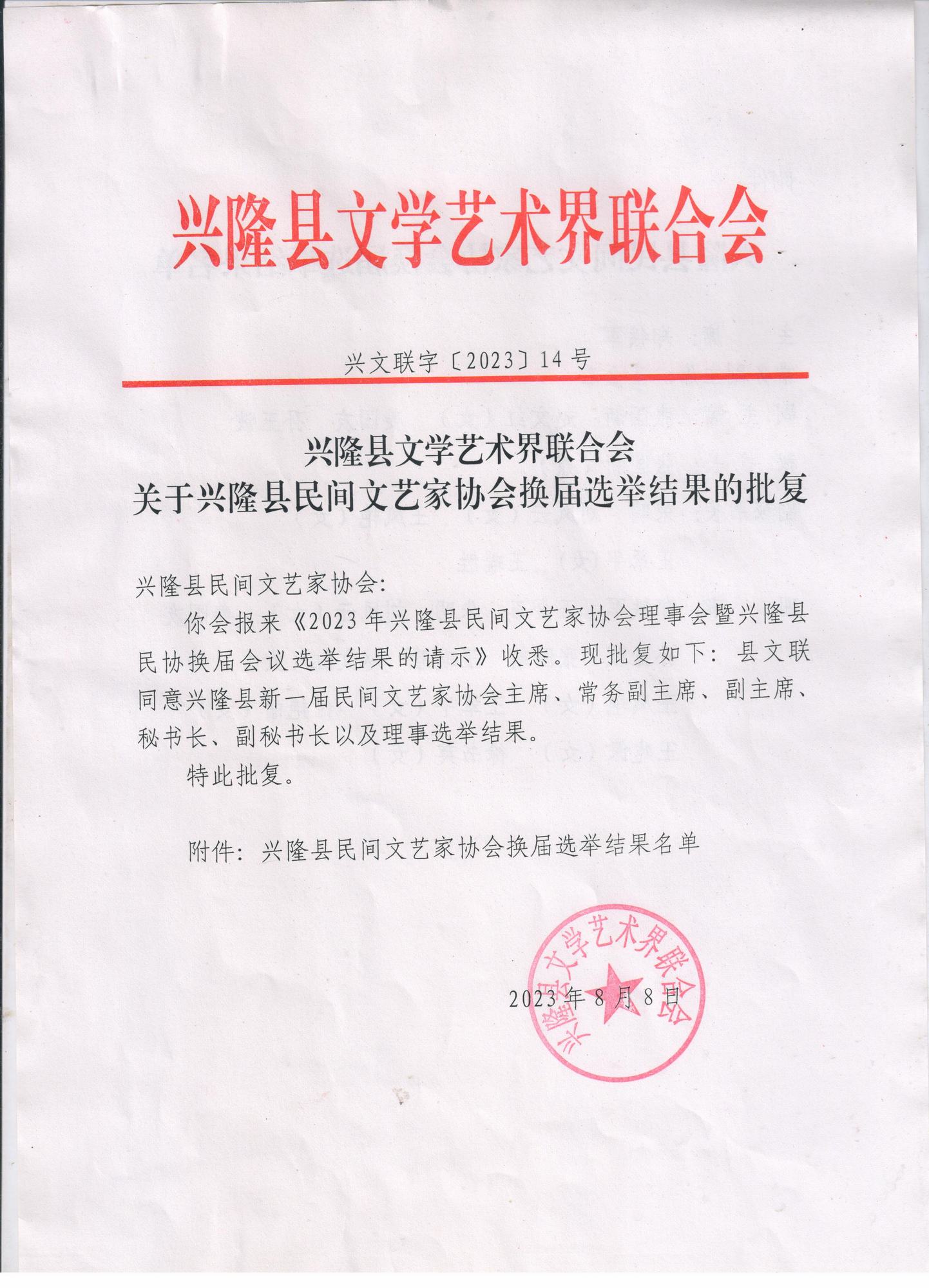 2023年8月8日,興隆縣民間文藝家協會(簡稱興隆縣民協)提交的《2023年興隆縣民家文藝家協會理事會暨興隆縣民協換屆會議選舉結果的的請示》獲興隆縣文學藝術家聯合會批復,興隆縣民協組織機構成員的批復如下: