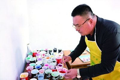 ■鄭鐵軍調制砂畫中的各色砂石原料
