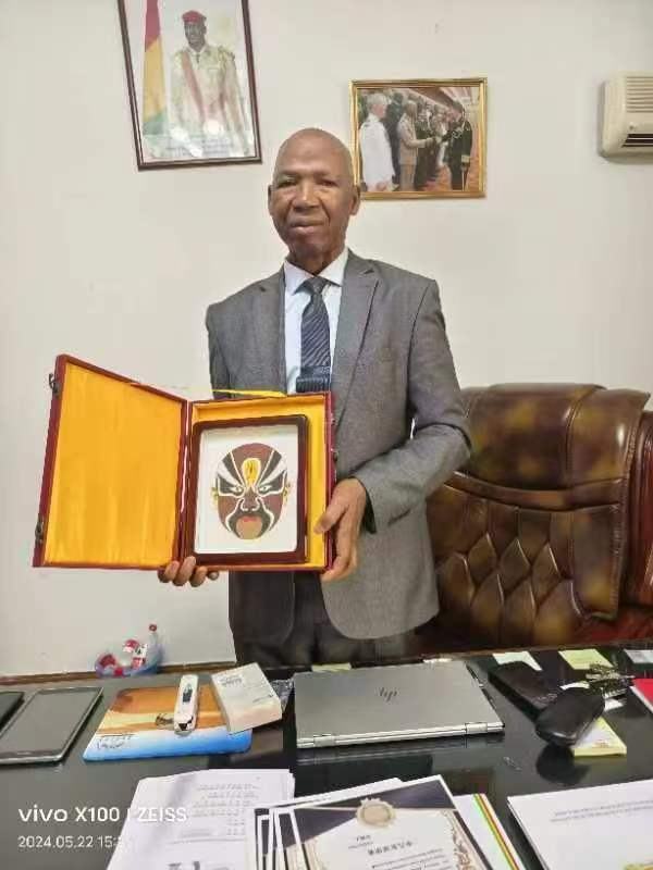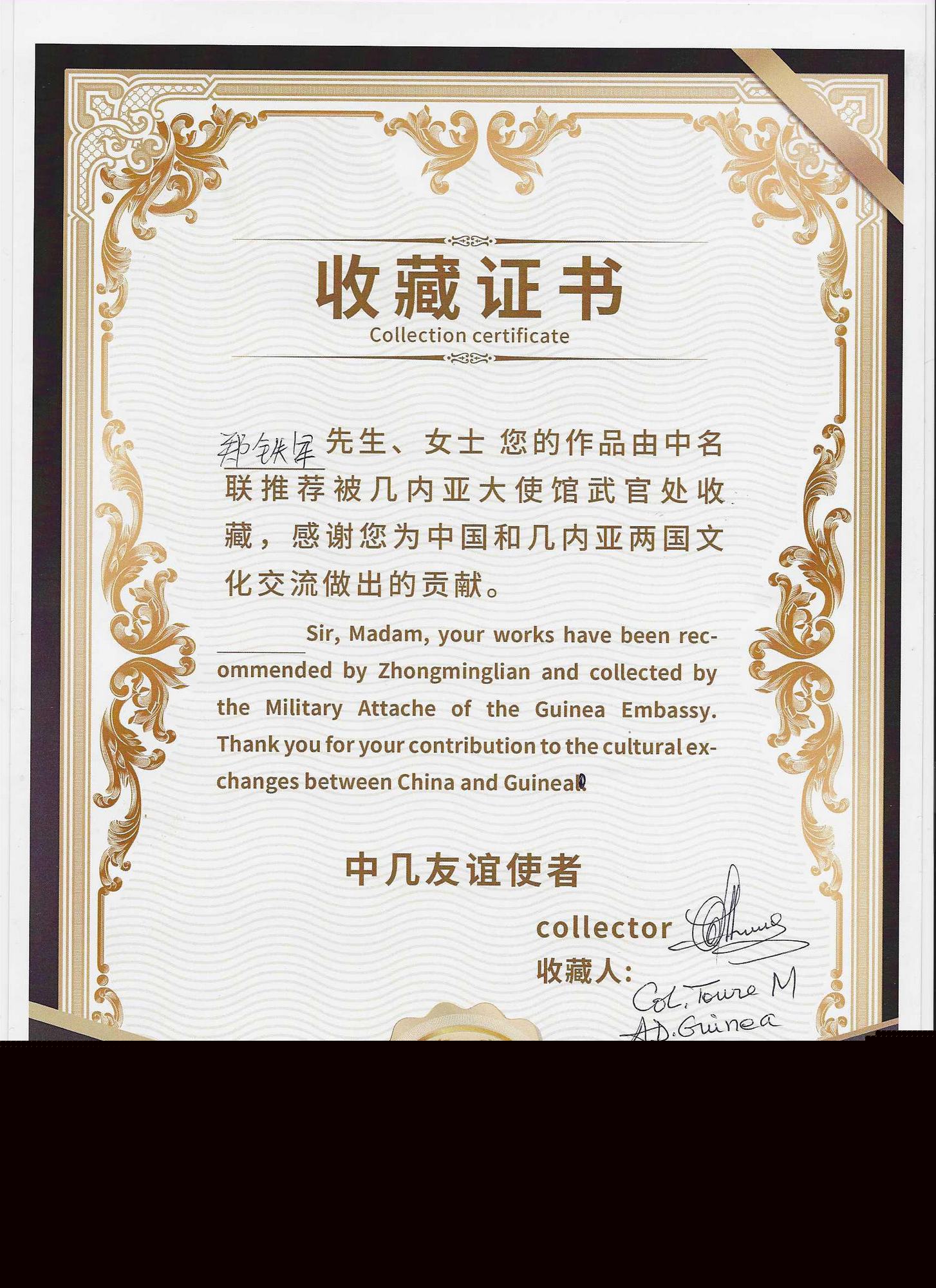 2024年5月22日,經幾內亞駐華大使誠邀,中名聯推薦,中名聯簽約國禮藝術家鄭鐵軍的砂畫系列作品走進幾內亞共和國駐華大使館,其中砂畫作品《臉譜》被幾內亞駐華大使館作為國禮珍藏,并授予鄭鐵軍中幾文化交流使者榮譽稱號。