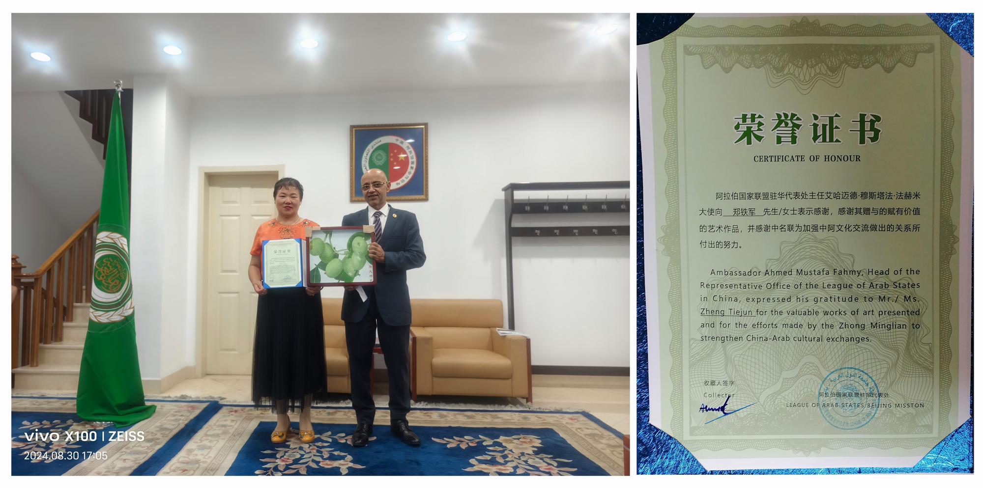 2025年1月16日,應阿拉伯國家聯盟代表處主任艾哈邁德·穆斯塔法·法赫米大使的盛情邀請,鄭氏砂藝形象代言人劉秀華攜中名聯簽約國禮藝術家鄭鐵軍的精美作品,參加在大使館舉辦的中阿文化交流活動,并代表興隆文化鄭氏砂藝進行了藝術品捐贈與收藏儀式。