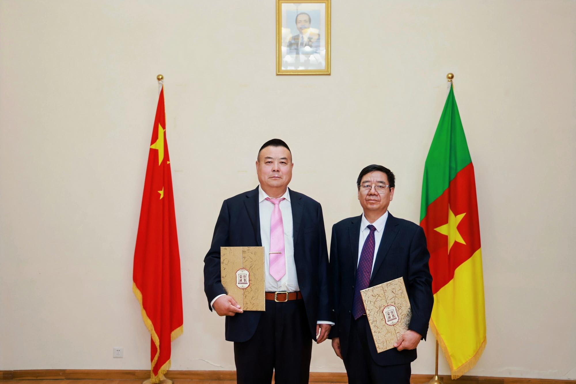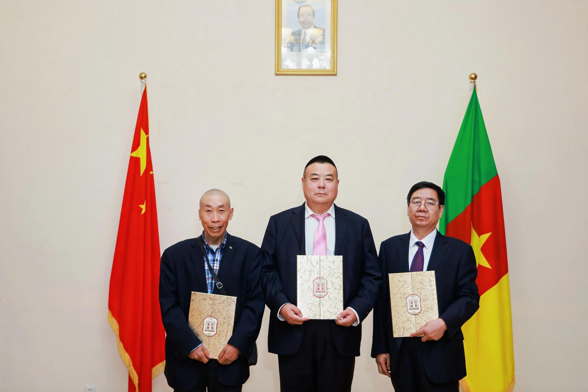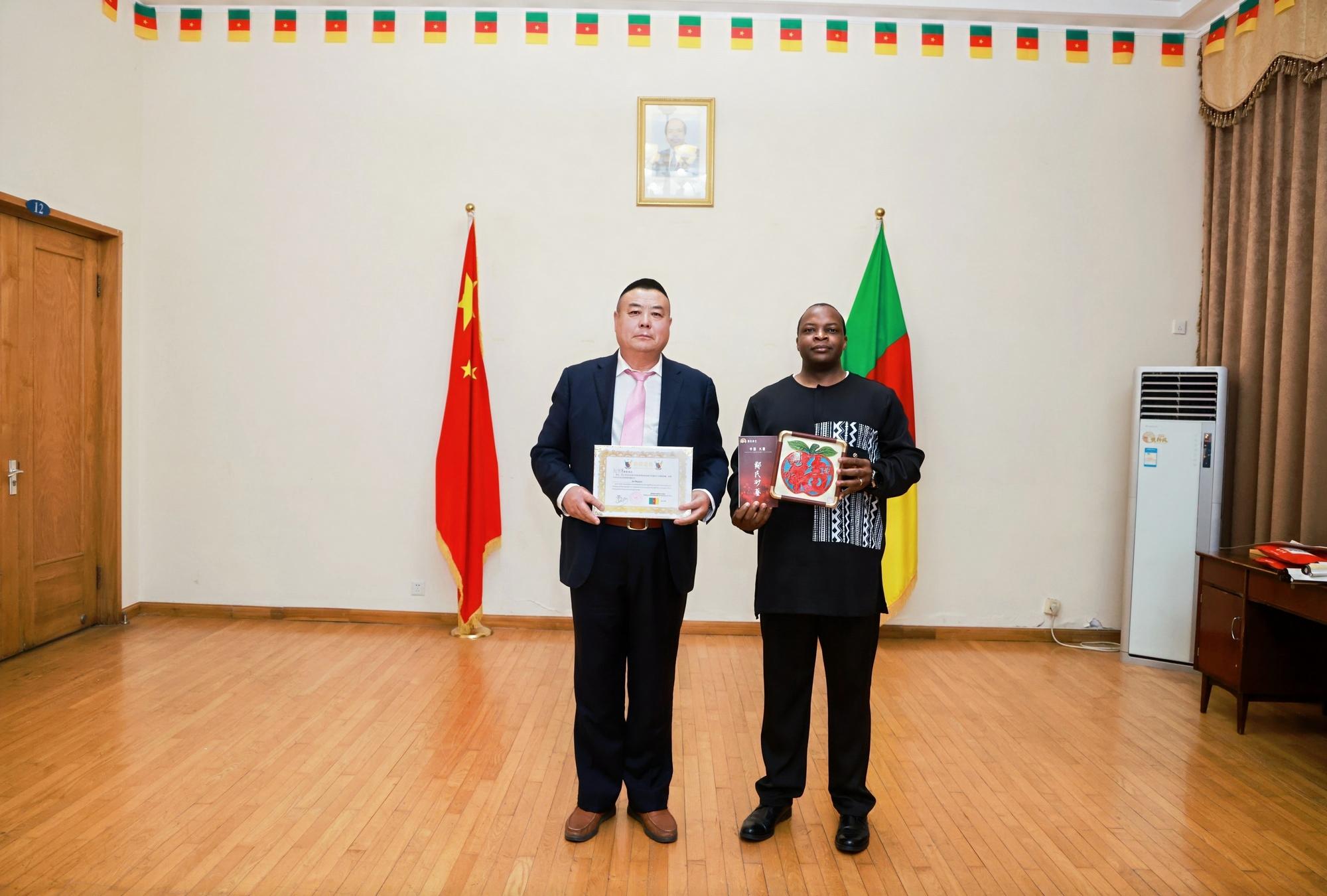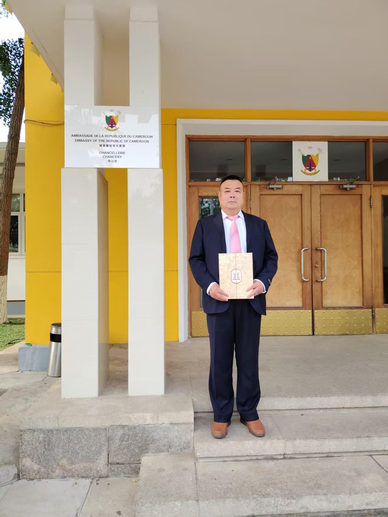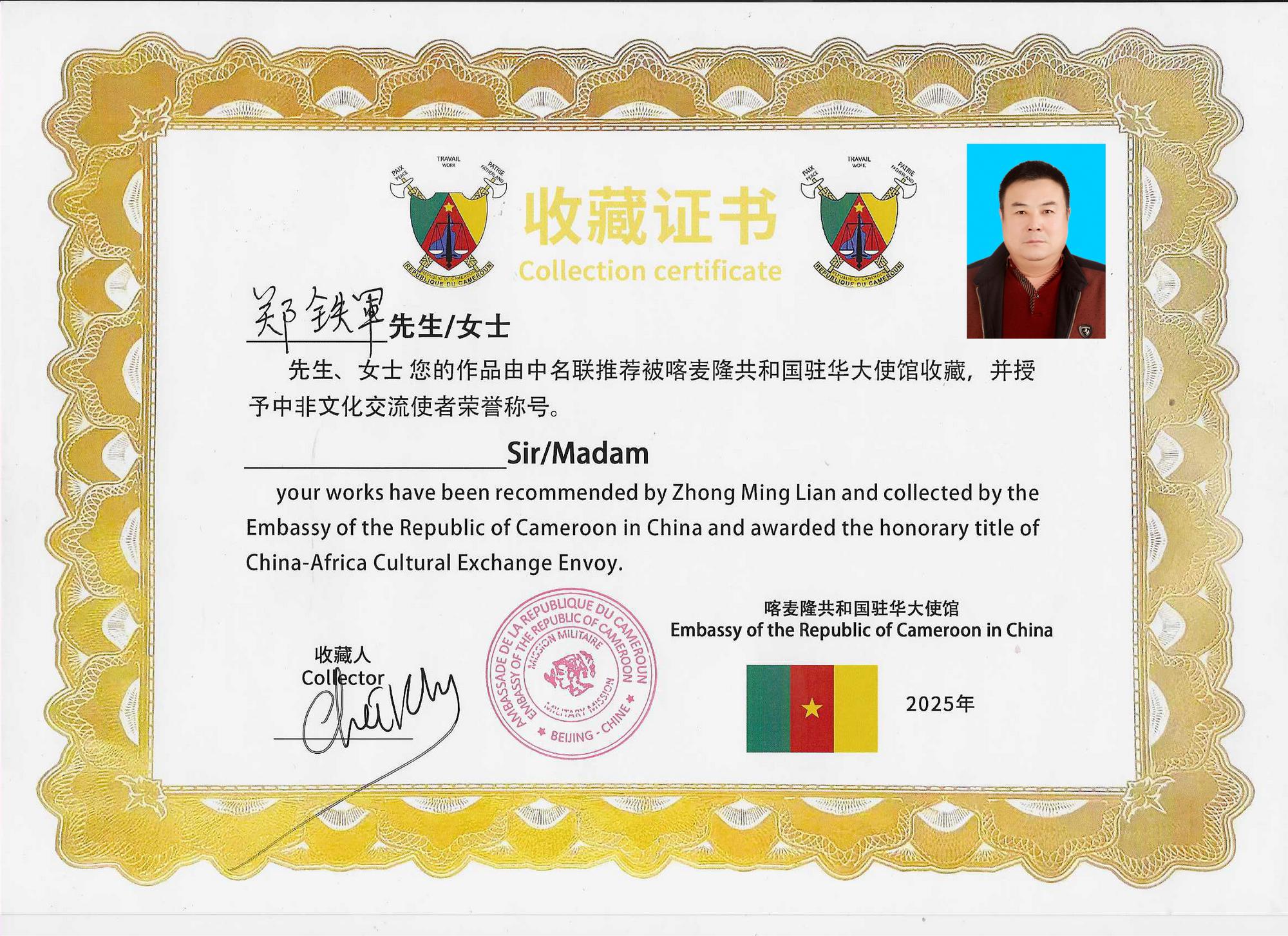 2025年4月26日,中名聯(lián)簽約國禮藝術(shù)家、非遺傳承人鄭鐵軍應(yīng)邀前往喀麥隆共和國駐華大使館,參與“一帶一路”中非文化交流活動。活動現(xiàn)場,其創(chuàng)作的非遺作品《平安福字》被喀麥隆大使館作為國禮永久收藏,標志著河北興隆縣傳統(tǒng)手工藝在國際舞臺上的又一次精彩亮相,成為中非文化交流的重要載體。喀麥隆駐華使館外交官朱利安·弗雷迪·埃托瓦代表使館,向鄭鐵軍頒發(fā)收藏證書,并授予其“中非文化交流使者”榮譽稱號 。