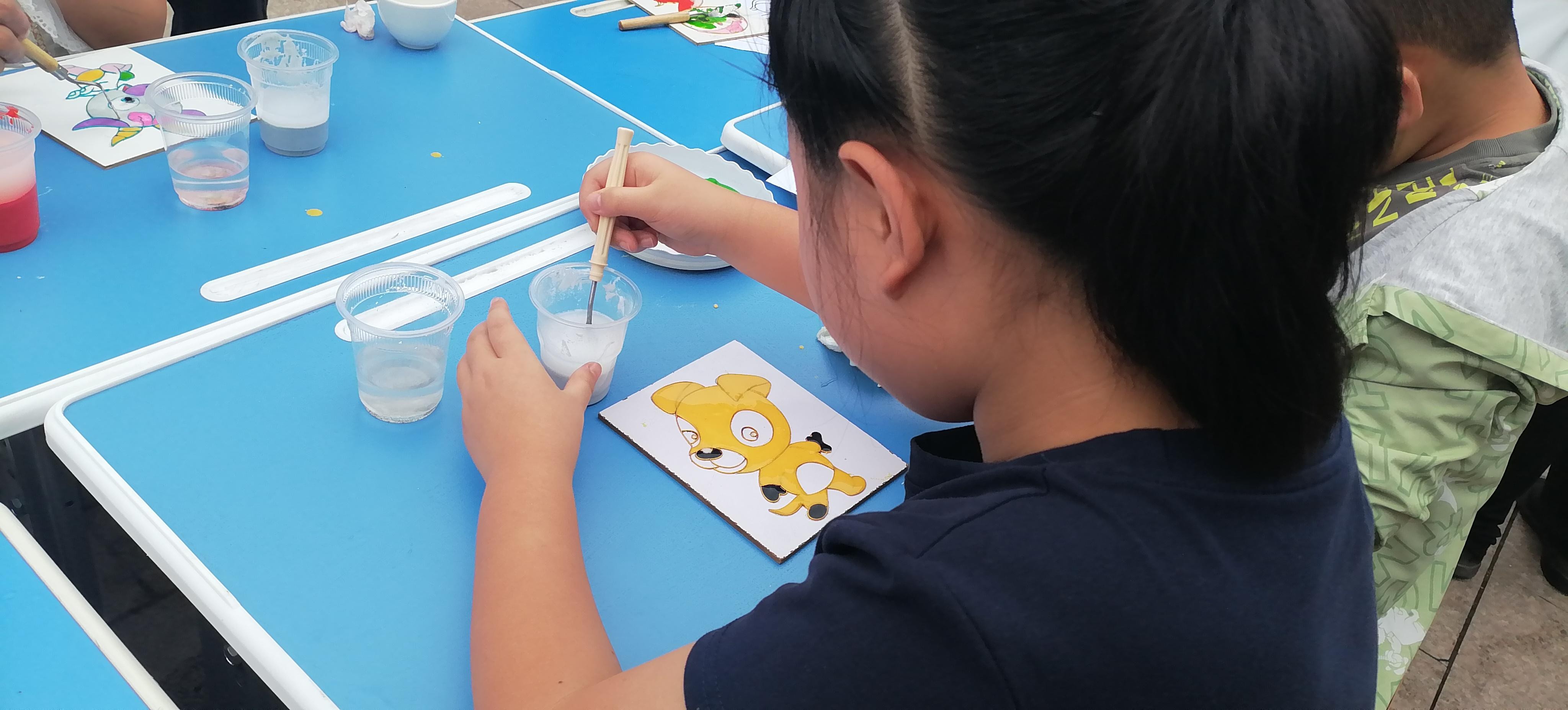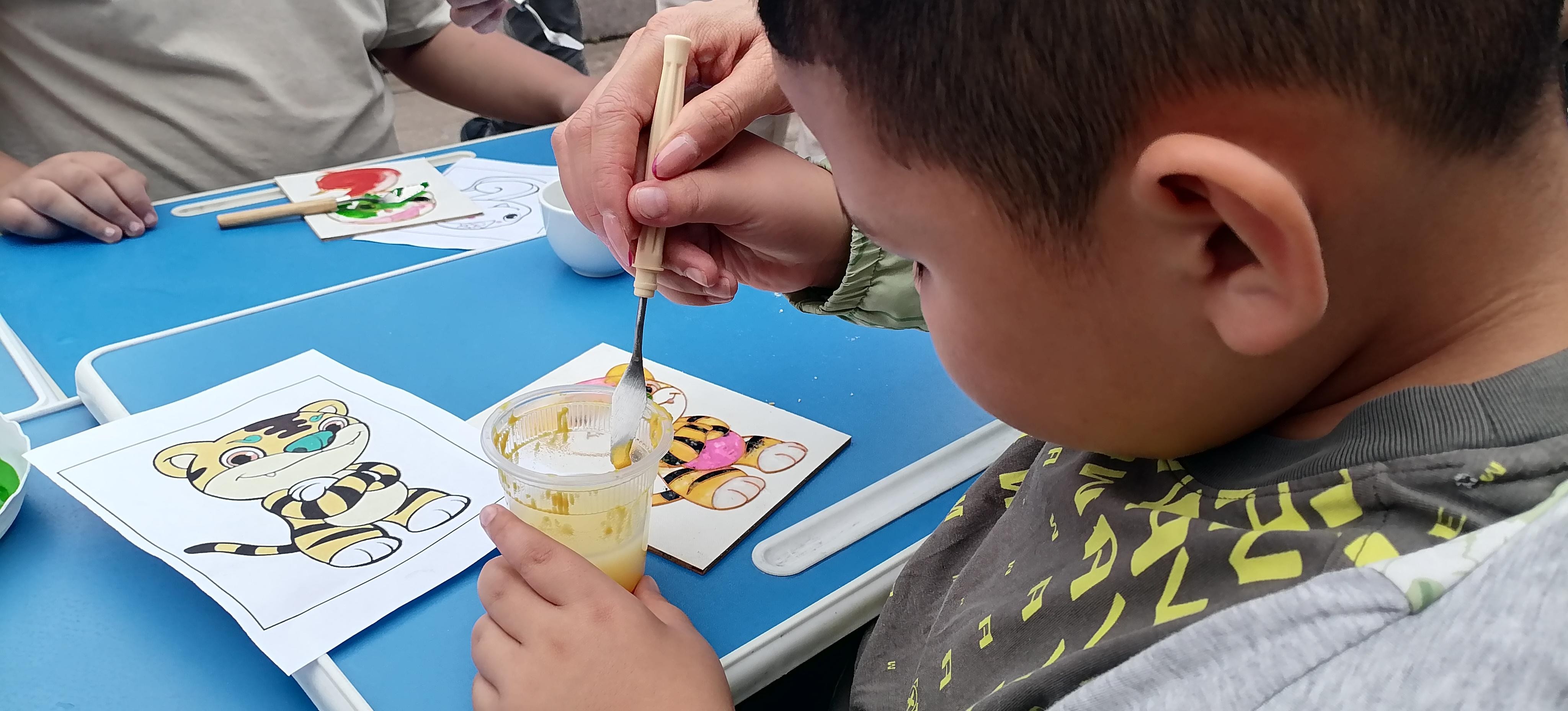 活動現場,鄭氏砂藝的“天然彩砂+金銀絲”工藝成為孩子們的“興趣焦點”。作為興隆縣的省級非遺項目,鄭氏砂藝以天然礦物彩砂為原料,采用金絲銀線勾勒圖案輪廓,再填充彩砂的傳統手法,既保留了鄉土文化特色,又蘊含著非遺技藝的巧思。為讓孩子們輕松參與,技師們特意提前制作了粘好金絲的半成品——一幅幅待填充的砂畫作品,將“最精彩的創作環節”留給孩子。“我要給小虎的臉涂綠色!”“我喜歡藍色的眼睛!”孩子們圍坐桌前,手持作畫小鏟,認真地將色彩砂石填入金絲框架,同時互相交流“配色秘訣”,現場充滿了童真與熱鬧。