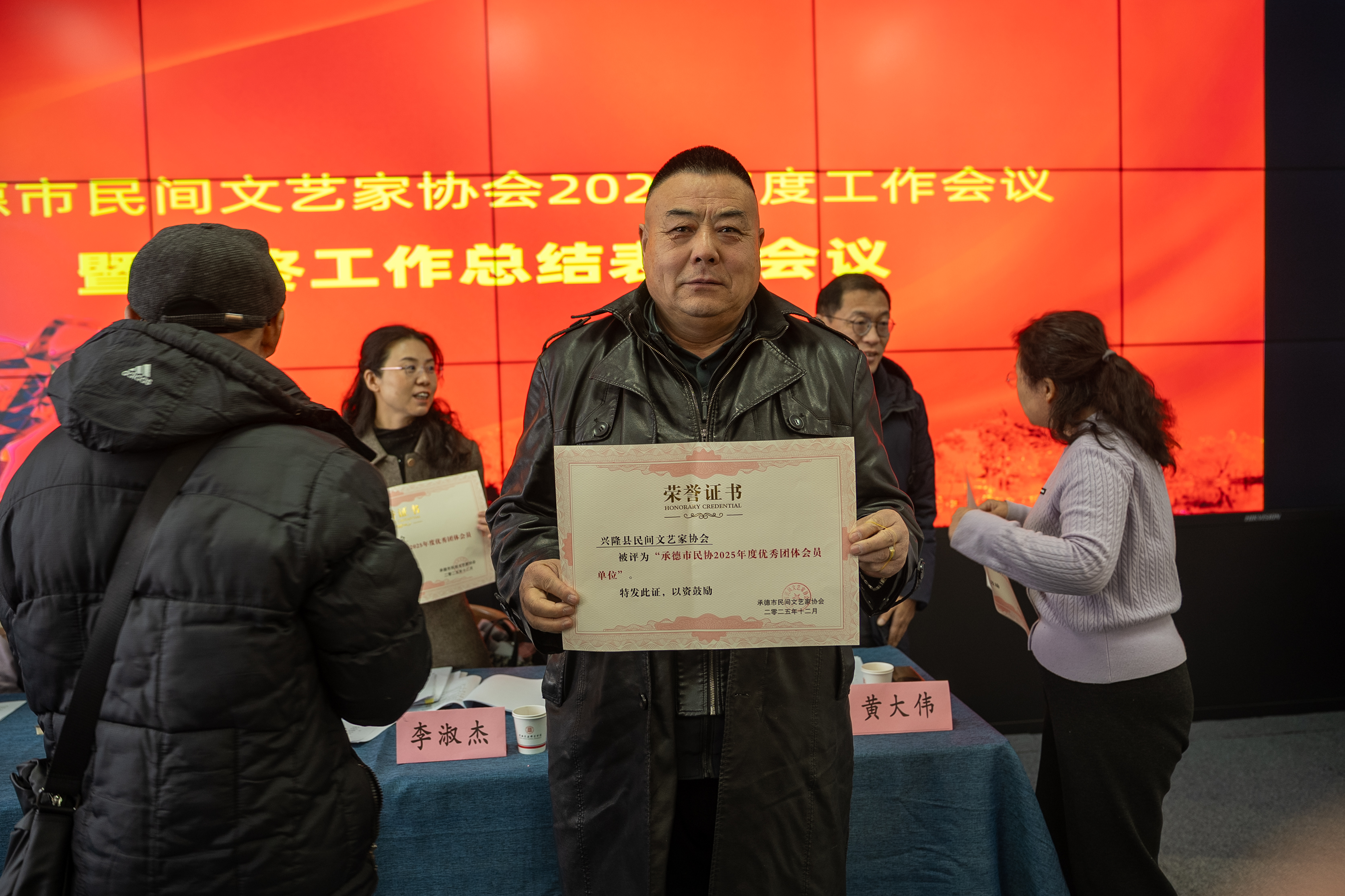 表彰環節中,市民協副主席朱長勝宣讀了2025年度評優名單。興隆縣民間文藝家協會憑借全年卓有成效的工作,獲評“2025年度優秀團體會員單位”。市文聯副主席李淑杰與市民協主席石俊鳳共同為其頒發榮譽證書。