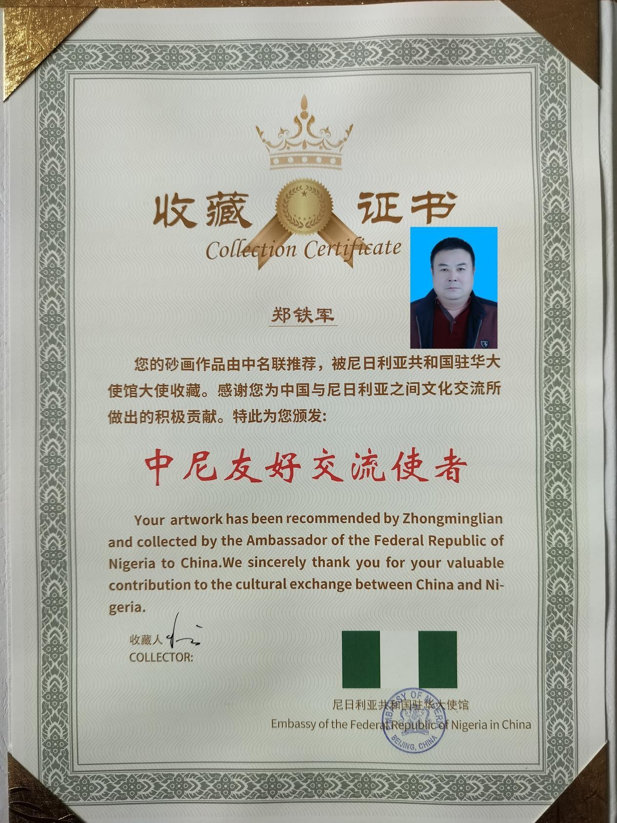 鄭鐵軍老師介紹道:“鄭氏砂藝起源于晚清秀才鄭克祥,歷經百年時光沉淀與五代匠人的薪火相傳,于21世紀初成功躋身省級非物質文化遺產名錄。該砂藝原料采自燕山腳下的彩色礦山,經精細研磨后,再經設計、制圖、掐絲、點藍、封裝等多道工序悉心雕琢,每件作品都承載著燕趙大地深厚的文化基因。此次收藏的砂藝作品《平安》更是寓意平安、吉祥與和諧,象征兩國發展蒸蒸日上。”尼日利亞駐華大使對這件砂藝作品贊不絕口,由衷贊嘆道:“這件作品讓我深切感受到中華文化的博大精深。”大使當場宣布收藏這件作品,并簽字留念,同時表示:“鄭氏砂藝融合自然與人文,彰顯中國文化魅力;中尼文化交流搭建起相互了解的橋梁,期待更多非遺項目互鑒互融。我將把這件作品陳列在使館文化區,以此見證中尼文化交流的深厚情誼。”