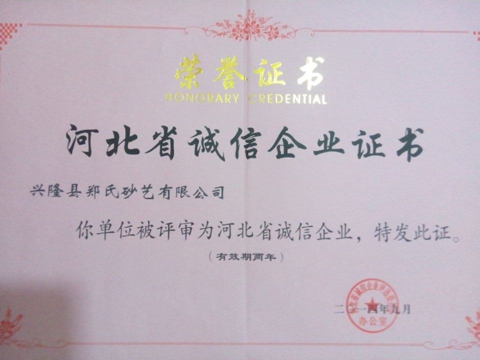 2014年9月26日,鄭氏砂藝有限公司被評(píng)為2014年“河北省誠(chéng)信企業(yè)”,公司的事跡同時(shí)錄入《河北省企業(yè)誠(chéng)信建設(shè)成果集》一書中。“河北省誠(chéng)信企業(yè)建設(shè)交流會(huì)”暨“河北省誠(chéng)信企業(yè)”授牌儀式9月26日在省會(huì)石家莊凱旋金悅大酒店舉行,公司總經(jīng)理鄭鐵軍參加了授牌儀式。鄭鐵軍總經(jīng)理同時(shí)被評(píng)為“2014年度河北省企業(yè)誠(chéng)信建設(shè)優(yōu)秀工作者”。