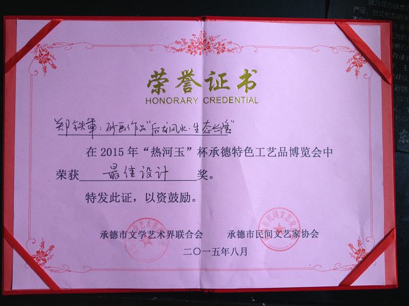 2015年8月,承德市文學藝術界聯(lián)合會和承德市民間文藝家協(xié)會舉辦了,2015年“熱河玉”杯承德特色工藝品博覽會,鄭氏砂藝文化有限公司總經(jīng)理鄭鐵軍的砂畫作品“后龍風水 生態(tài)興隆”榮獲《最佳設計獎》。